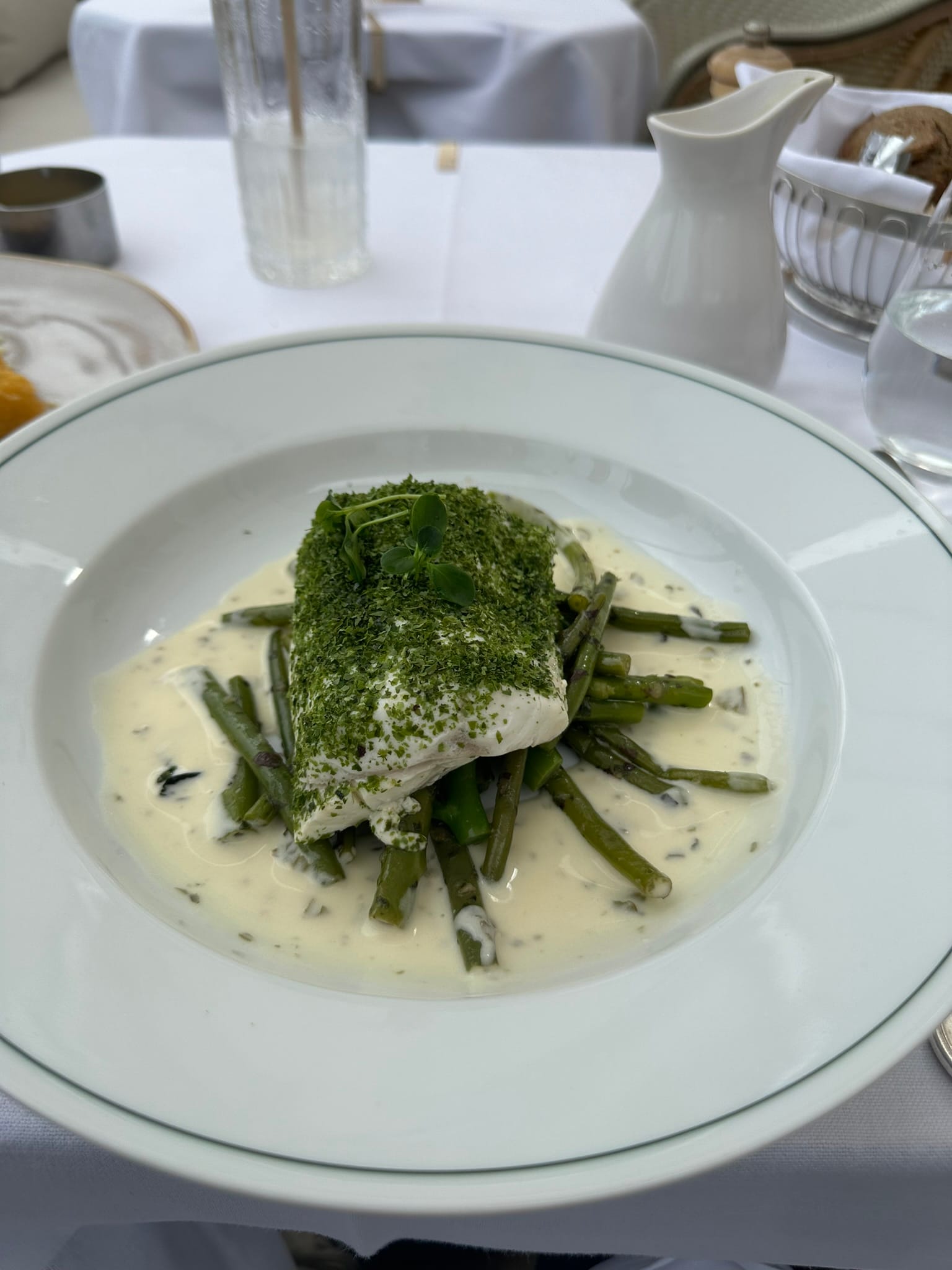 The poached cod arrived dusted with some other-worldly green powder, perched atop a bed of French green beans (which somehow sound more elegant when you say haricots verts). All of this was nestled in a pool of buttery cream sauce—rich, decadent, and so inviting that, if it were possible, I’d have gladly taken a swim in it myself.