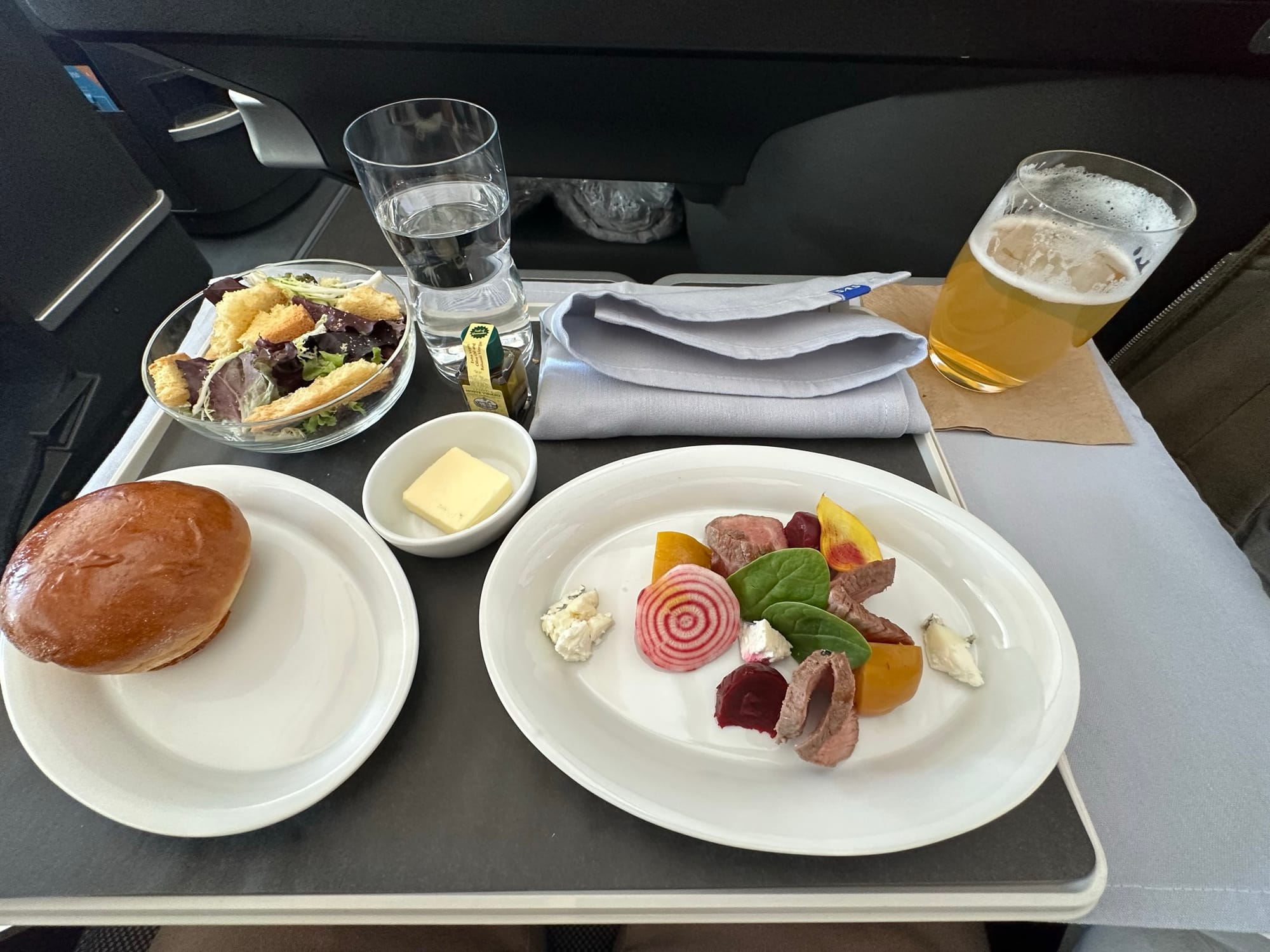 Once we reached cruising altitude, the three-course meal service began. There’s something undeniably luxurious about flying through the air at 500 mph while being served fine dining-level cuisine by SAS’s own chef. Each course offered several options, and I’ll share my selections. The first course was a chilled appetizer: sliced filet mignon—an interesting choice to serve cold—accompanied by beets, cheese, and sweet potato. Alongside this was a fresh salad, and a bread basket was brought around, allowing you to handpick your preferred type of bread.