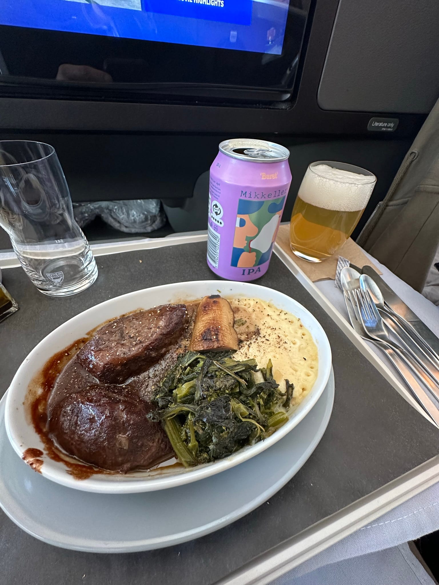 The main course was a braised beef roast in a red wine sauce, served with sautéed greens and mashed potatoes, all presented in a piping hot dish. The quality was outstanding—bold, rich flavors and meat so tender you could easily eat it with a spoon. It was the kind of dish that made you forget you were thousands of feet in the air, feeling more like a cozy dinner at a high-end bistro than an in-flight meal.