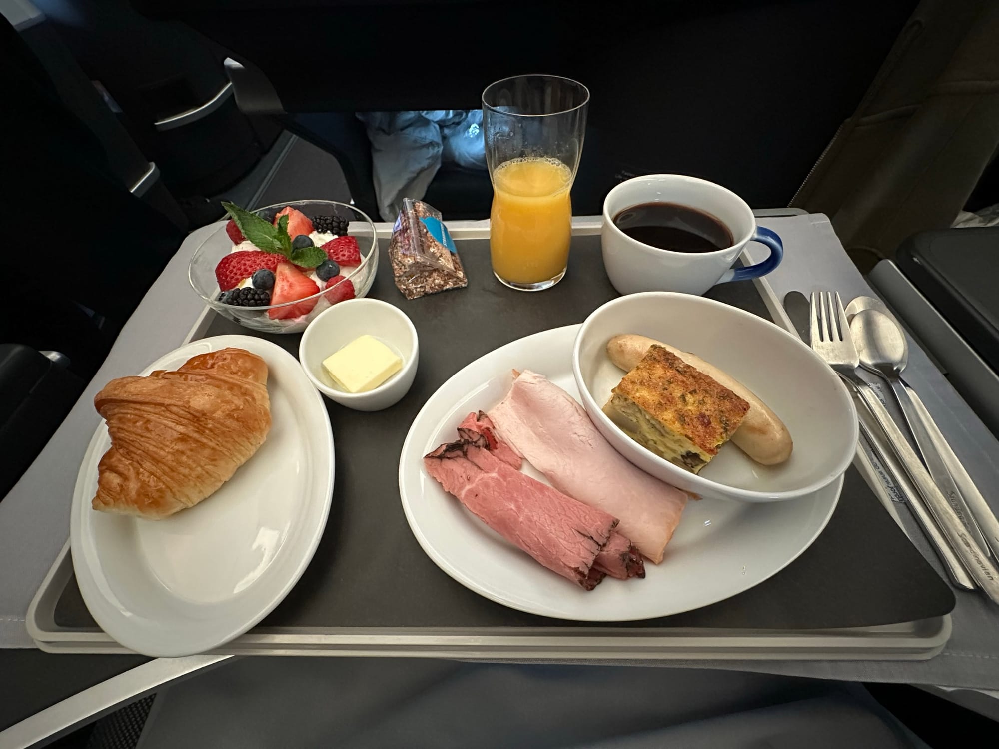 I was gently awoken by a flight attendant (they had asked previously if we would like to be woken up for breakfast service or not – to which I obviously said yes) to have breakfast service. Fresh and quite good breakfast on this aircraft, I felt as if I was already in a Danish café. I was served a plater containing roast beef, ham, vegetable quiche, some sort of sausage, fruit and yogurt parfait, croissant, orange juice and coffee. Delicious and filling to prepare us for our journey into Copenhagen that day.